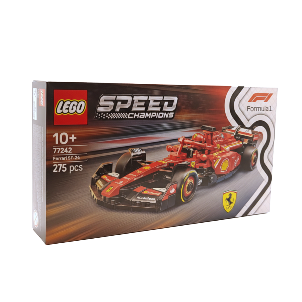 LEGO Speed Champions Ferrari SF-24 F1 Race Car Driver Set (77242) lets you build the 2024 Ferrari F1 car in a detailed, display-ready model. It features authentic race touches like the halo bar, rear wing, wishbone suspension, sponsor decals, and wider rear tyres styled with “Pirelli.” Includes a Ferrari driver minifigure with a winged helmet so kids can jump straight into race-day roleplay. Great for ages 10+ and F1 fans who want something fun to build, race around, and proudly show off.